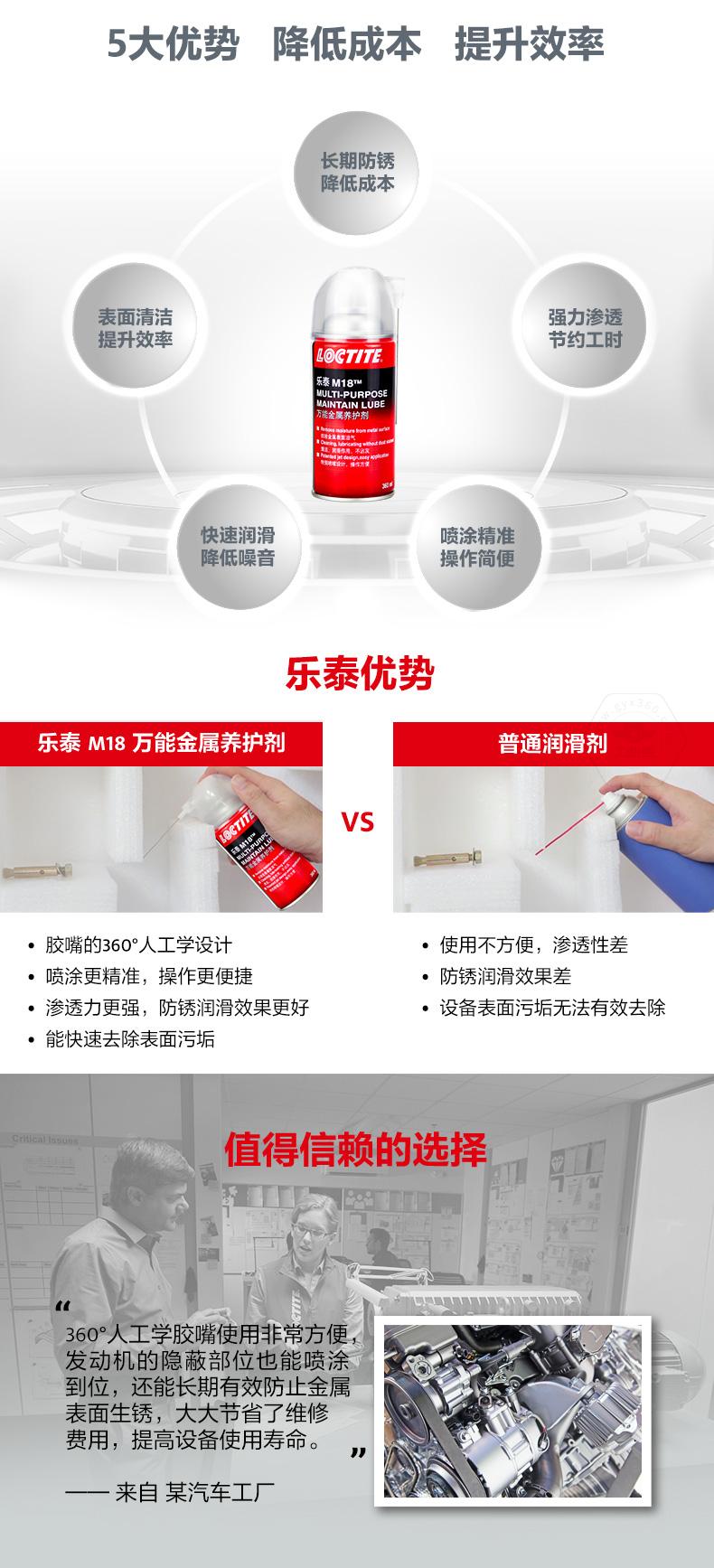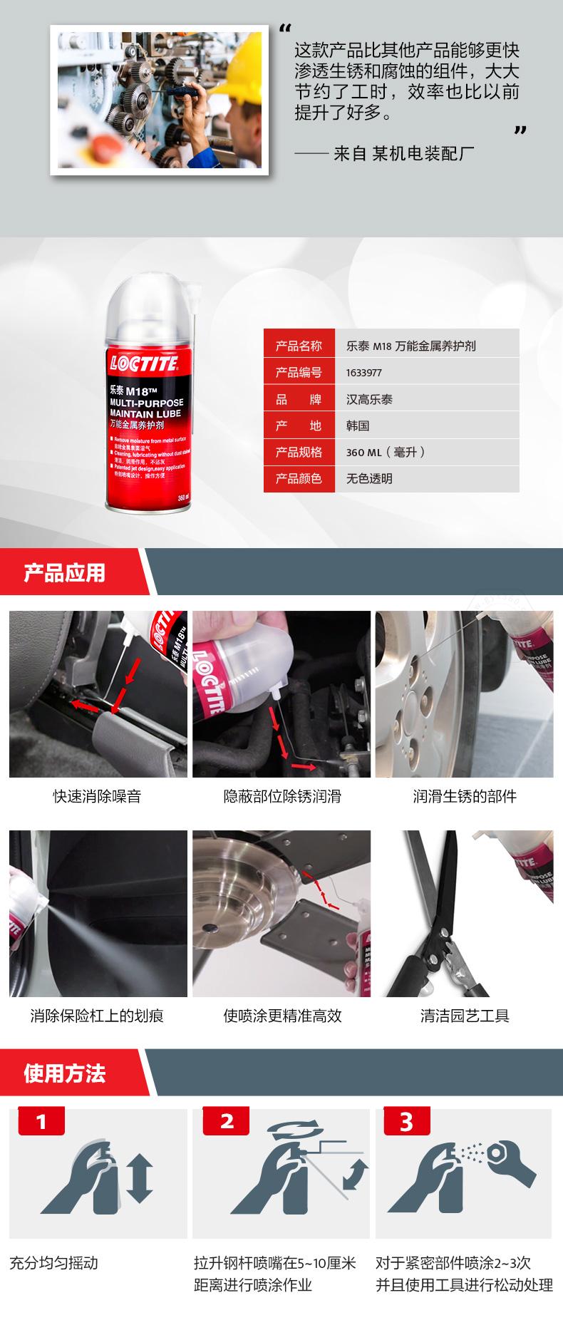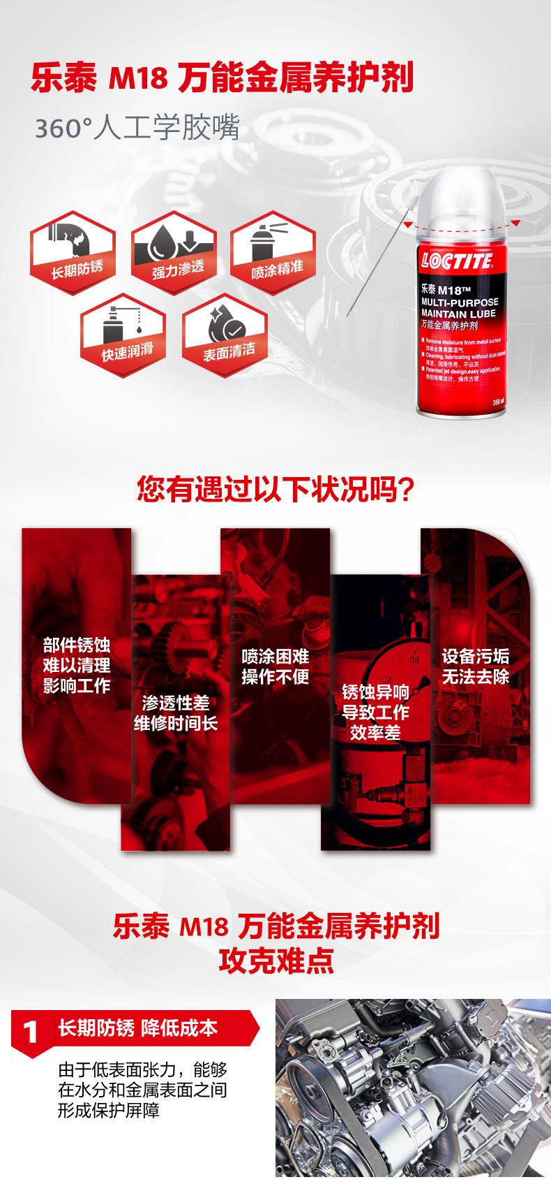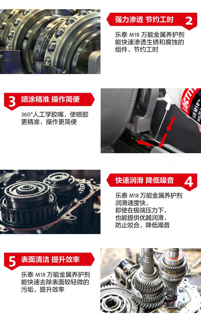 樂泰M18萬能金屬養(yǎng)護(hù)劑是一款集防銹、滲透、潤滑、清潔于一體的產(chǎn)品。樂泰M18萬能金屬養(yǎng)護(hù)劑由于低表面張力,能夠在水分和金屬表面之間形成保護(hù)屏障,實(shí)現(xiàn)長期防銹。樂泰M18萬能金屬養(yǎng)護(hù)劑可快速滲透生銹和腐蝕組件,節(jié)約工時。樂泰M18萬能金屬養(yǎng)護(hù)劑采用360°人工學(xué)膠嘴,噴涂更精準(zhǔn),操作更簡便,還可快速潤滑并降低噪音,同時去除表面較輕微污垢,提升效率。