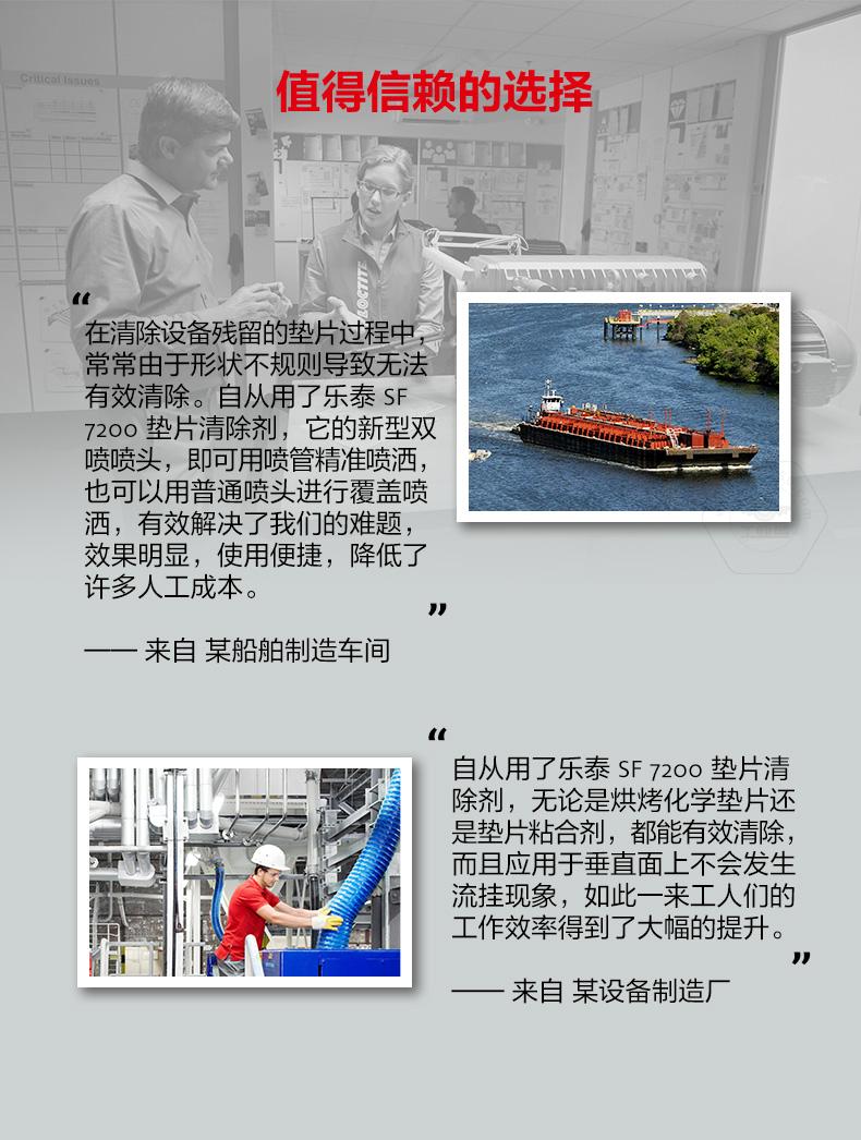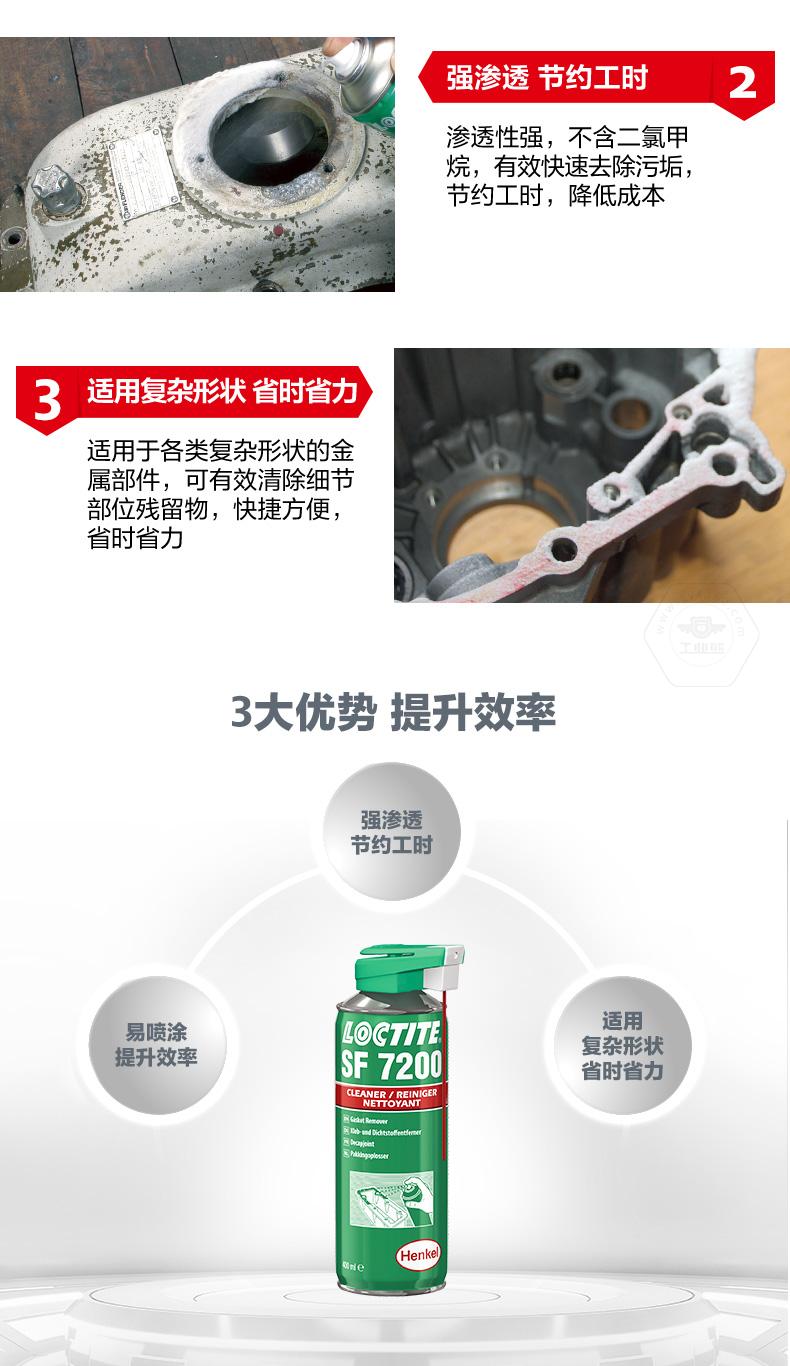 樂泰SF7200墊片清除劑主打易噴涂、強(qiáng)滲透和適用于復(fù)雜形狀部件。樂泰SF7200墊片清除劑采用新型雙噴噴頭,既可用噴管精準(zhǔn)噴灑,也可用普通噴頭覆蓋噴灑,垂直面上不流掛,操作更方便。樂泰SF7200墊片清除劑不含二氯甲烷,可快速去除污垢,節(jié)約工時(shí),降低成本。樂泰SF7200墊片清除劑適用于從鋁或其他軟金屬法蘭面上去除墊片,也可用于清除膠粘劑、油脂、積碳、干燥油漆和清漆殘留。